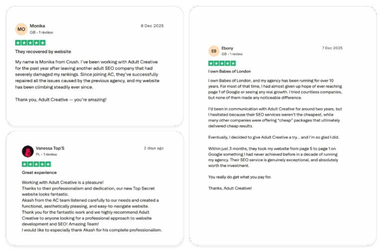 When Babes of London finally committed to Adult Creative, the results were immediate. Within three months, we achieved Page 1 rankings for the highly competitive “London Escorts” keyword, generating thousands of pounds per month in bookings.
