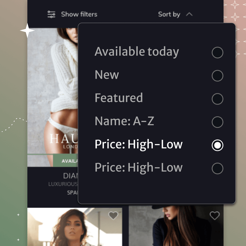 Let your clients easily view which girls are available for incall or outcall for a better user experience.